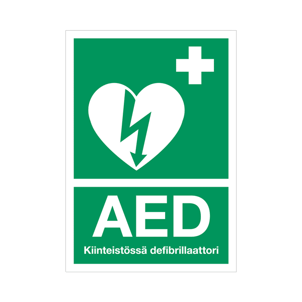 AED-kyltti ilmaisee defibrillaattorin sijainnin.