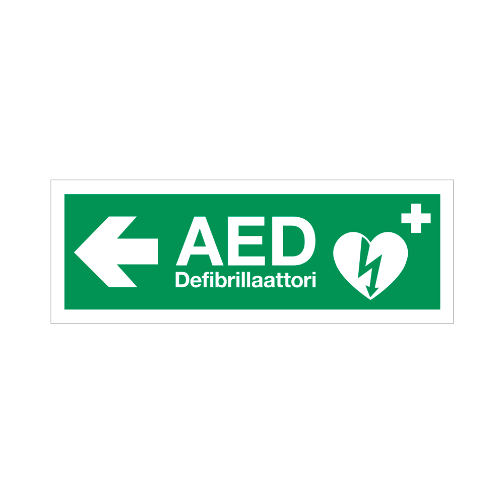 Etusivu / Tuotteet / Defibrillaattorikaapit ja opastekyltit / Opastekyltit / Opastekyltti heijastava / AED-kyltti – nuoli vasemmalle – heijastava muovi