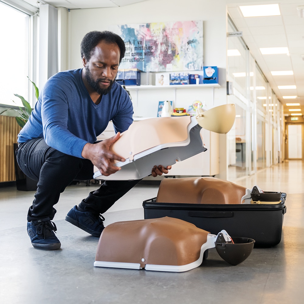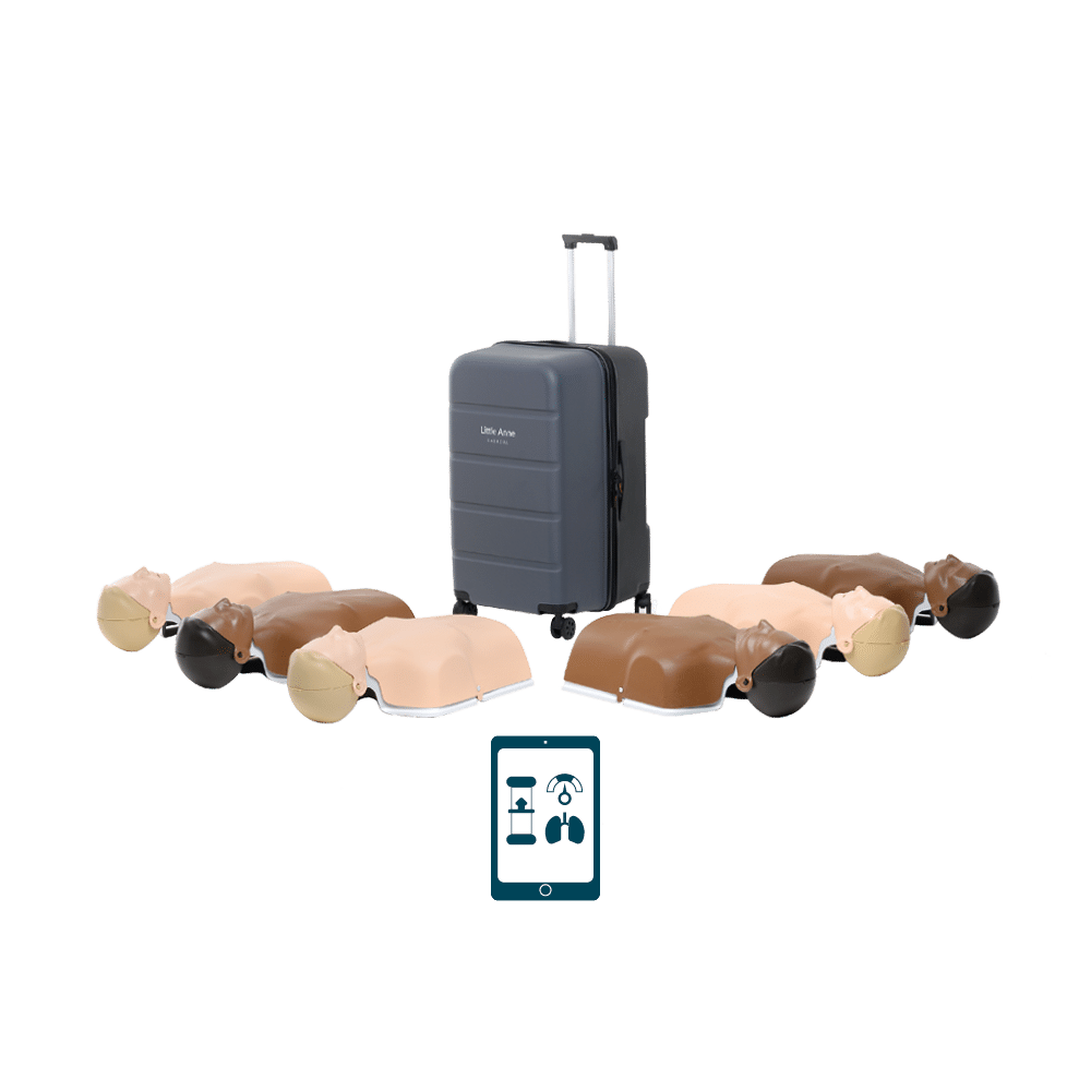 Pakkaukseen kuuluu 6 Little Anne -elvytysnukkea (3 vaaleaa ja 3 tummaa) pinottuna käytännölliseen pyörillä varustettuun matkalaukkuun, turvallista ja helppoa kuljetusta varten.